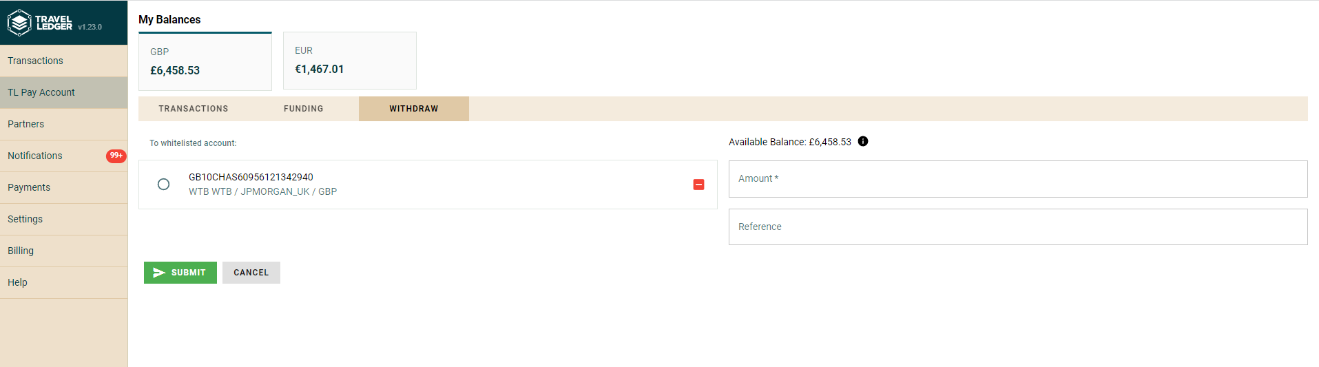 You are able to easily withdraw funds from your TL Pay Account to any whitelisted Beneficiary bank accounts you have added ([see funding for more detail on beneficiaries](https://help.travelledger.org/tl-pay-account/broken-reference)).